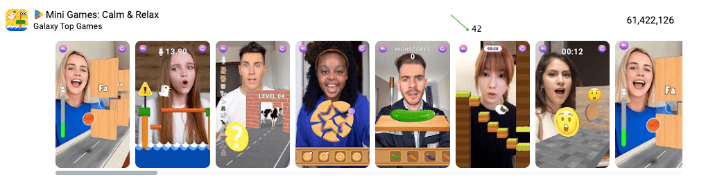 Creative Analysis: User-generated content is their biggest strength and they have cracked this content flywheel by seeding in ads that mimic this experience. For their seeded ads, they’ve got people/actors, or probably team members, recording themselves playing the game and then widely distributing it. It’s entertainment. In one of the levels and video ads you need to pronounce a bunch of words in the correct manner to clear it, but the pronunciation is intentionally wrong in the last obstacle, and the ad ends there. Which leaves you hanging for closure, so you download it to try it yourself. They also have a few playable ads but not at scale.