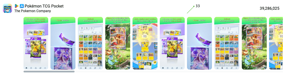 Creative Analysis: The entire game revolves around bragging rights and the ads revolve around nostalgia. The high-performing ads are videos and HTML videos that are anchored on opening Pokemon card packs, with a focus on a swiping mechanism to tear the packet. The sound of that fresh packet tearing open honestly unlocks a core memory which is followed by the delight of finding a legendary Pokemon or a rare card inside it.