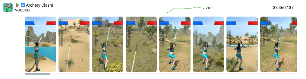 Creative Analysis: The top assets are all videos being run as HTML on Applovin, but in the last few months they’ve started scaling on interactive playable ads as well. By volume, they get almost 50% impressions from Applovin and 30% from YT. The top-performing playable is actually quite weird, you’re throwing teddy bears instead of shooting arrows??? The others are quite clickbaity as well, where the ads show players using gun scopes for aiming. Not sure if these are working for Archery Clash, and begs the question - what is their D1 retention like?
