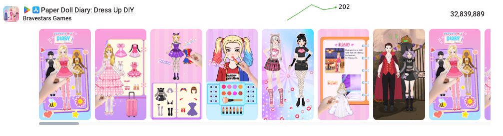 Creative Analysis: It’s impressive that they’ve cracked their user acquisition with just 48 creatives! They mainly focus on showing the multiplayer functionality at the beginning of the ad where you compete with an opponent to dress up the game character better. They’re leveraging Unity’s ad network to scale their ads by using playable videos with a GIF end card that seems interactive and ask you to select between 2 outfits. However, clicking on it takes you to the app store. A dark design, but seems to be working for them nonetheless.
