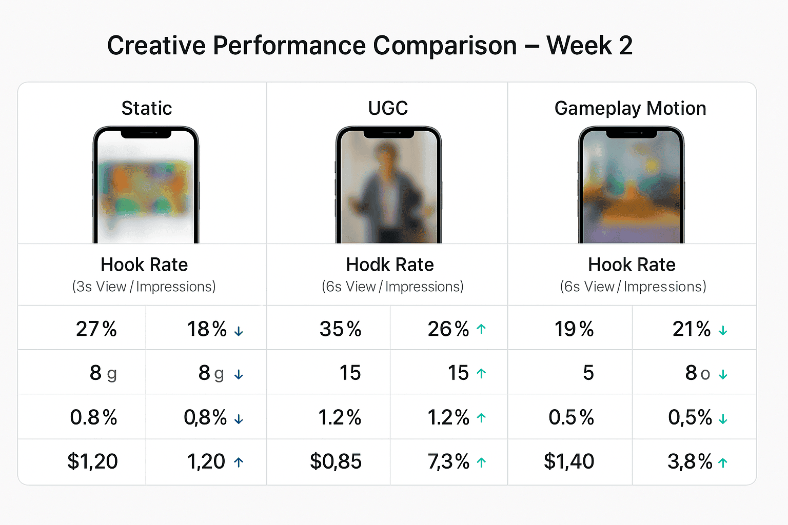 Group creatives by idea, not just format (e.g., “problem-solution,” “aspirational,” “raw gameplay”). - Watch the Engagement Metrics