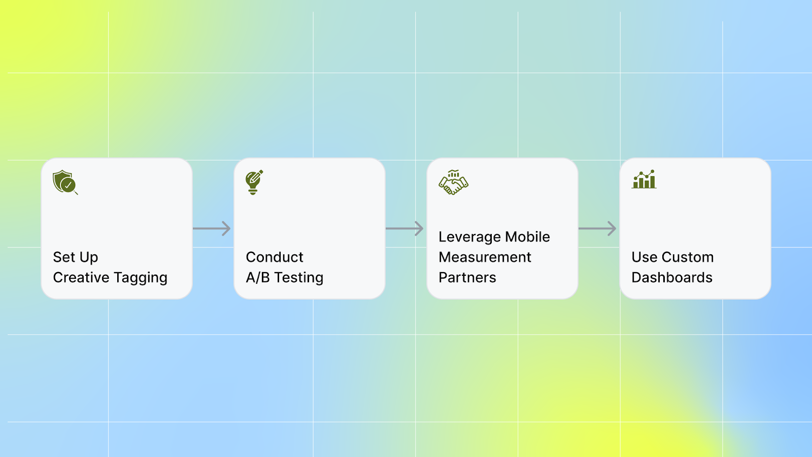 Mobile Measurement Partners MMPs help track post-install activity and attribute installs, retention, and conversions to specific creatives. Integrate an MMP with your ad campaigns to measure long-term performance and refine your creative strategy.