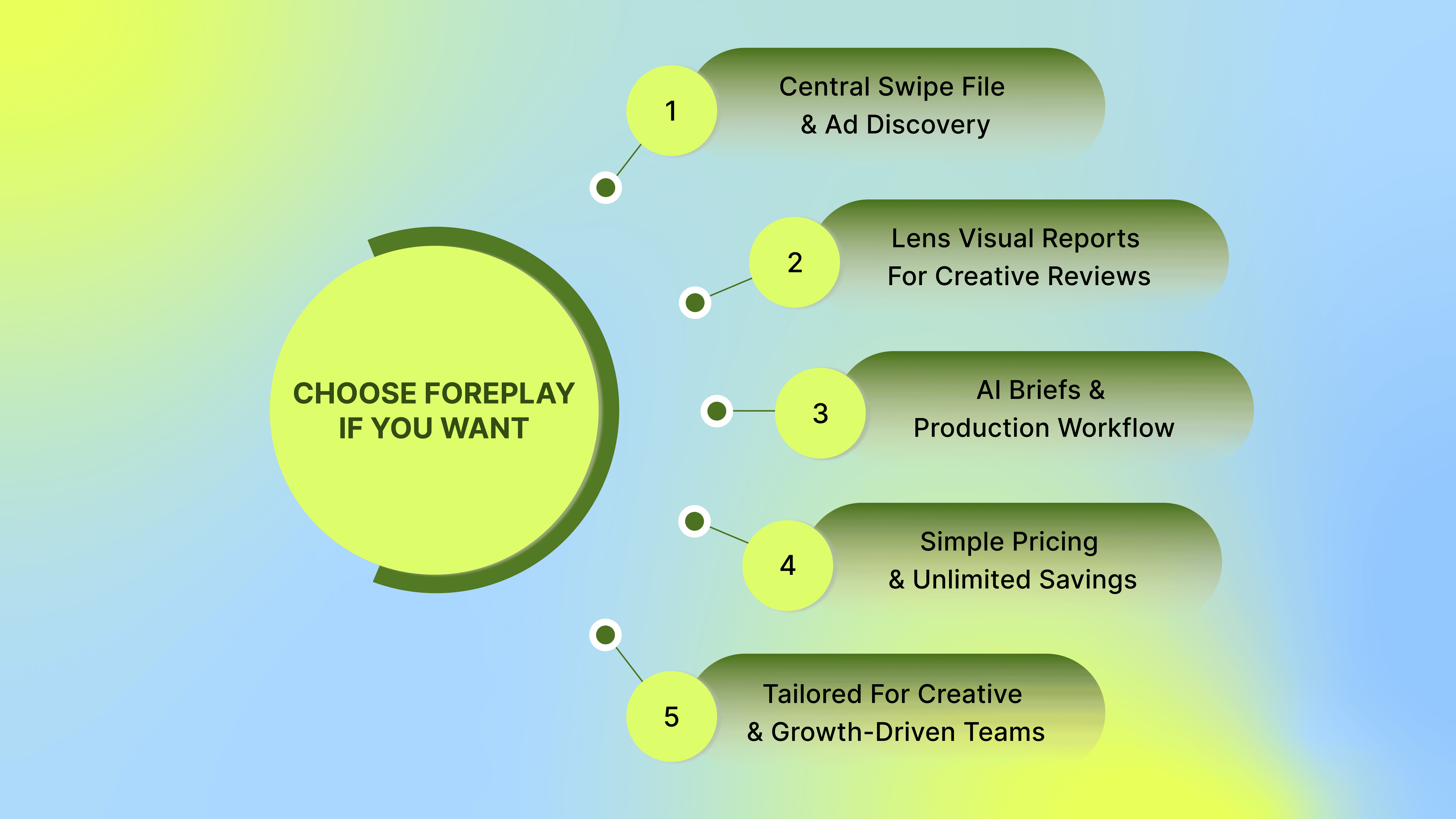 Foreplay focuses on ad discovery, swipe files, creative briefs, and a visual creative analytics product called Lens that helps teams review performance.