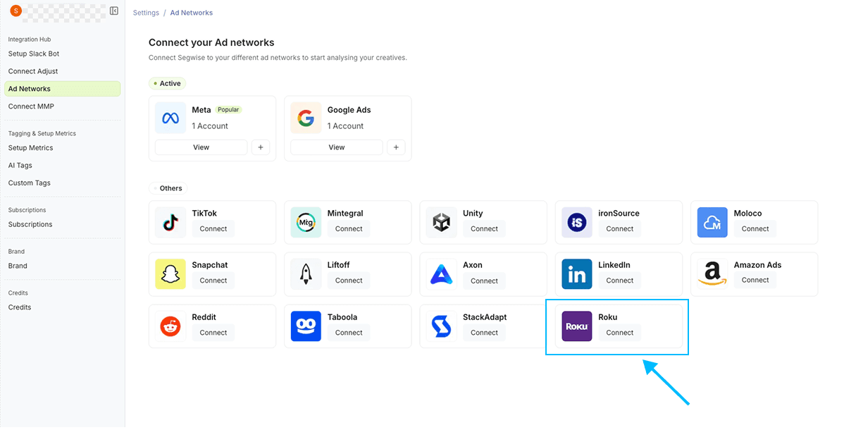 In your Segwise dashboard, go to “Settings” > “Ad Networks”