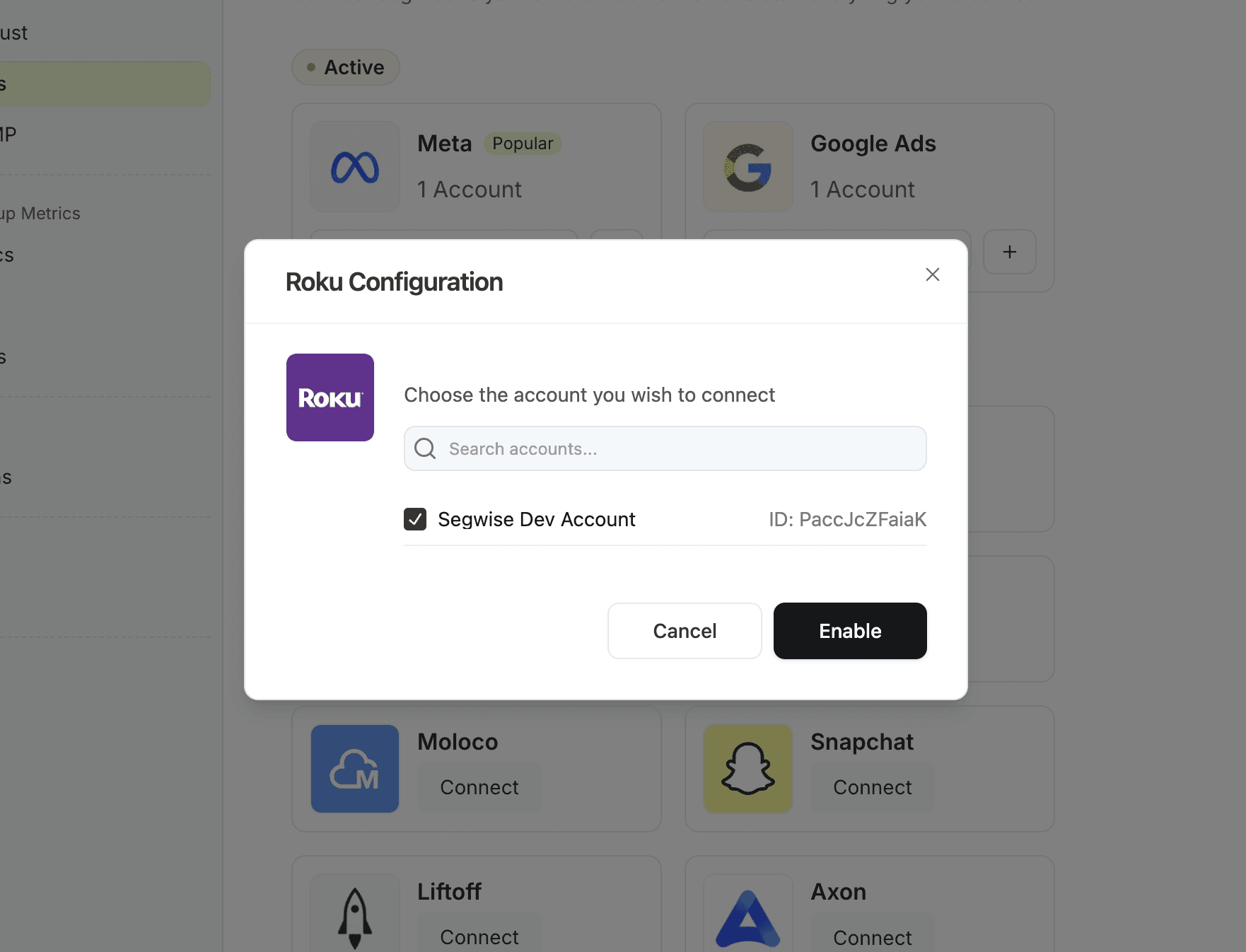 Choose the Roku Ads Account that you want Segwise to connect to. You can connect as many accounts as you wish. For example here the account is Segwise Dev Account.