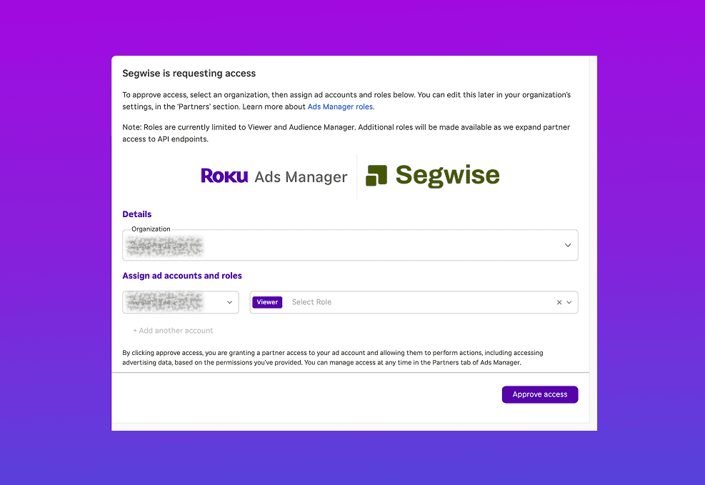 To set up your Roku ads account, you would need someone who has access to the Roku Ads account to “Sign in with Roku” and grant Segwise permission to your marketing data.